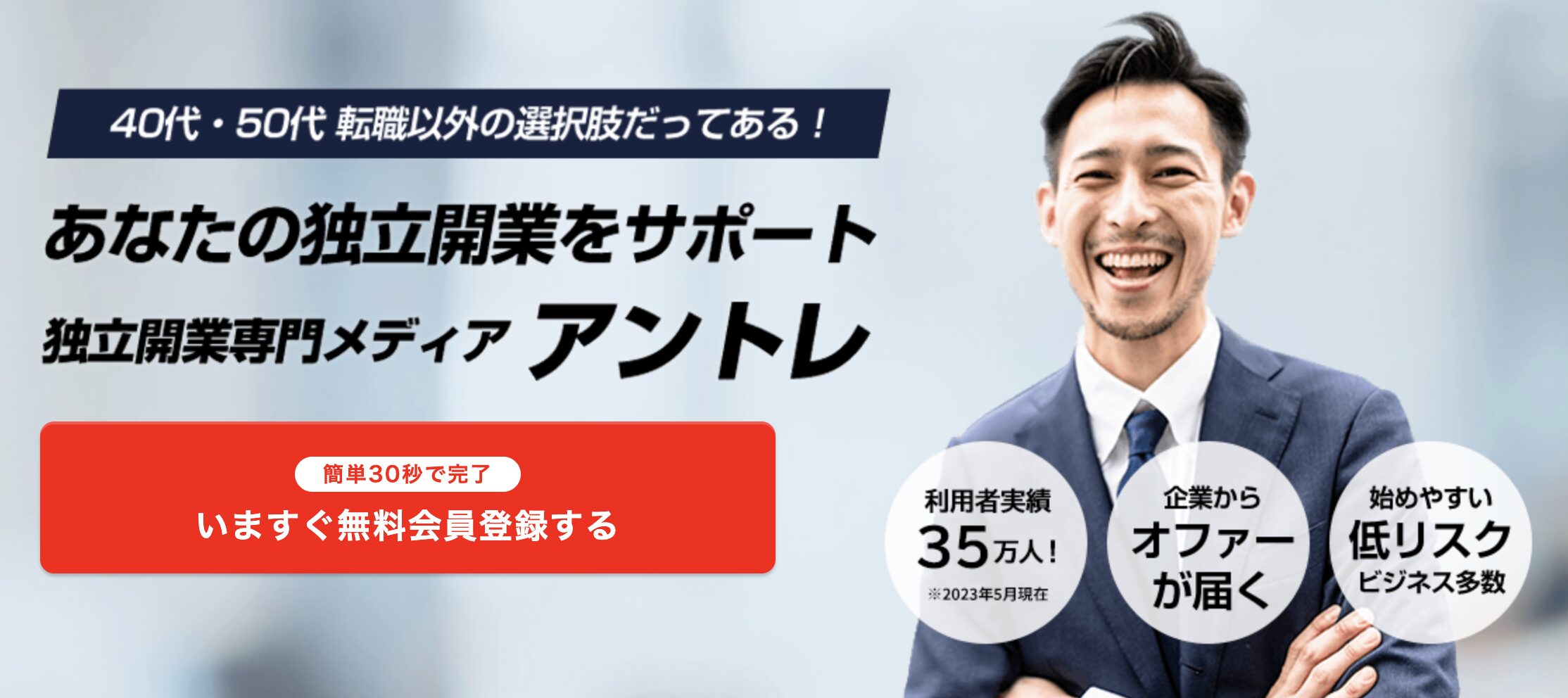このまま会社員を続ける以外の道も見てみたい。いつかは自分の力で働いてみたい。そんな気持ちを持ちながらも、何から調べればいいかわからない方にとって、アントレは独立・開業の選択肢を具体的に比較しながら、自分らしい働き方を探しやすいサービスです。まずは情報収集から始めたい方にも、本気で独立を考えたい方にも、次の一歩を見つけやすくなっています。