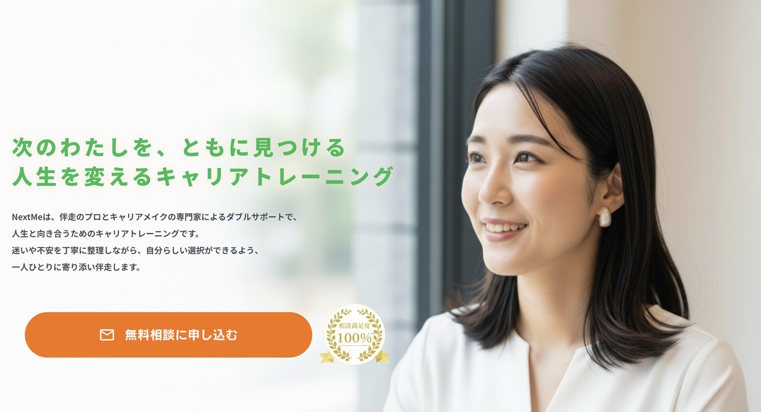 今の働き方に違和感はあるけれど、転職するべきか、このまま今の職場で頑張るべきか、自分でもまだうまく言葉にできない。そんなときに相談しやすいのが「NextMe」です。次の仕事を探すことだけをゴールにするのではなく、これからどんな成長を目指したいのか、どんな価値を発揮していきたいのかを整理しながら、自分らしいキャリアの進み方を見つけていきたい方に向いています。伴走のプロとキャリアメイクの専門家によるダブルサポートで、迷いや不安をひとつずつ整理しながら前に進みたい方にも取り入れやすくなっています。