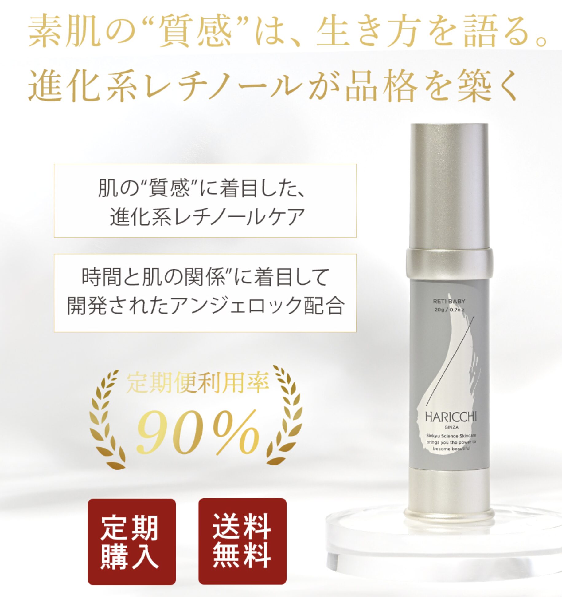 乾燥やハリ不足、ごわつき、キメの乱れなど、年齢とともに変化する肌印象が気になりはじめた方に取り入れやすいのがReti Baby(ハリッチ レチベイビー)です。素肌そのものをなめらかで澄んだ印象へ整えたい方に向いており、ただ攻めるだけではなく、毎日のケアの中で心地よく続けやすいレチノール発想のクリームとして使いやすくなっています。肌の“質感”に着目した設計が特長で、見た目の印象だけでなく、触れたくなるようななめらかさを目指したい方にもぴったりです。