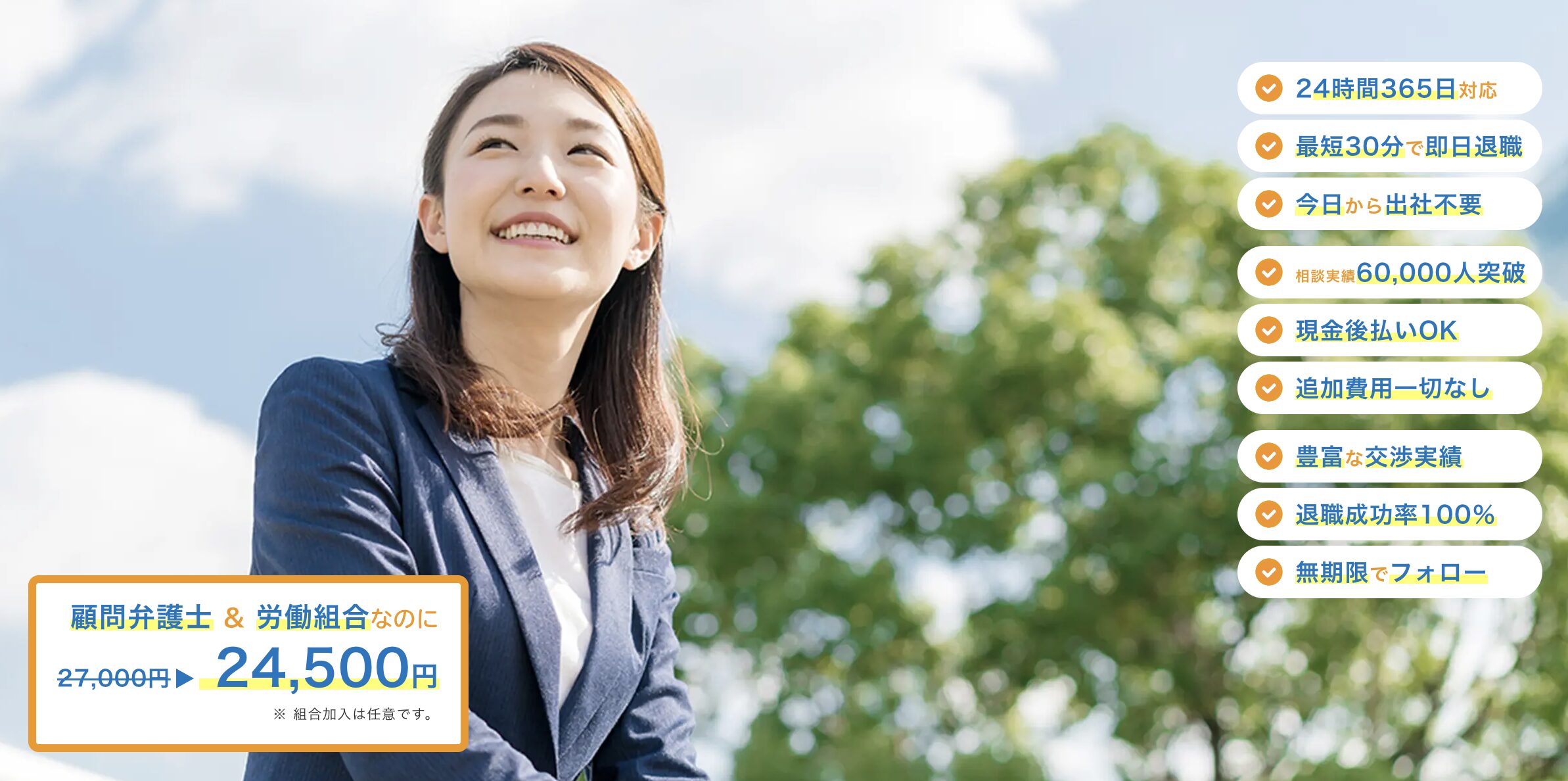安心感を重視したい方にも選びやすく、顧問弁護士の監修があり、労働組合とも連携しているため、必要に応じて会社との交渉にも対応しやすい体制が整っています。料金は通常27,000円のところ24,500円(税込)の案内があり、追加費用は一切なし。支払い方法もクレジットカード、銀行振込、コンビニ決済、PayPay、翌月後払いに対応しているので、今すぐ辞めたいけれど手元資金が心配な方にも使いやすくなっています。2名以上の同時申込みや、入社辞退・入社3日以内の退職向けには19,800円(税込)の特別料金も用意されています。